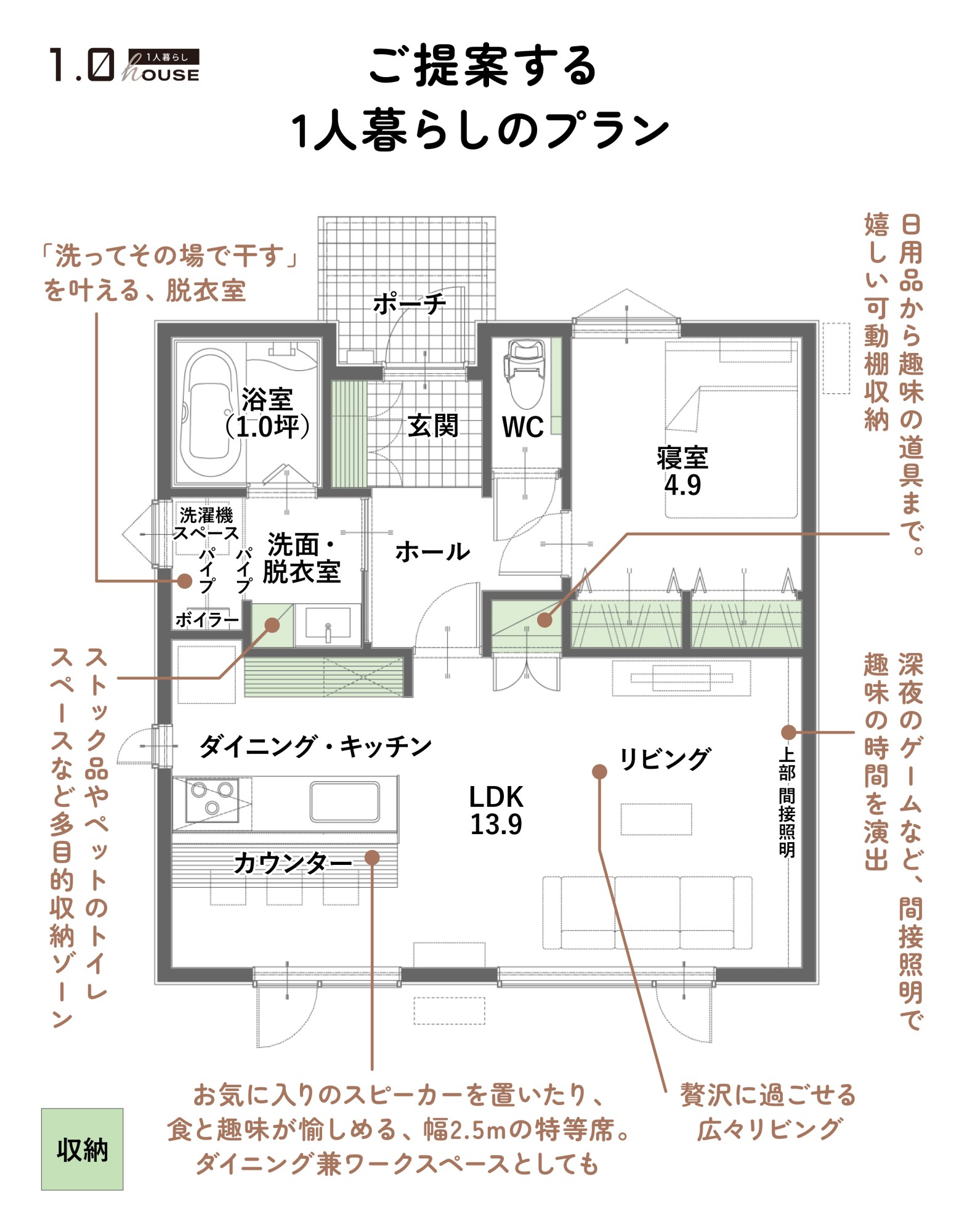 PLAN 商品プラン 1人暮らしAタイプ 1人暮らしAタイプ 平屋 1LDK 合計施工床面積 16.22坪 16.22坪本体価格1,815万円(税込) 月々45,465円 建物本体価格 坪数16.22坪 建物価格1,815万円 合計1,815万円 ※別途付帯工事費がかかります ローンシミュレーション 金利0.95% 返済期間40年 借入額1,815万円 月々の支払い45,465円 N様 T様 その他のプランを見る 2025. 12. 05. 平屋 1人暮らしAタイプ 16.22坪本体価格1,815万円(税込) 月々45,465円 2025. 12. 05. 平屋 1人暮らしDタイプ 16.22坪本体価格1,815万円(税込) 月々45,465円 2025. 12. 05. 平屋 1人暮らしFタイプ 18.23坪本体価格1,870万円(税込) 月々46,843円 随時見学予約受付中 【予約受付中】平屋最新モデルハウス【オープン】