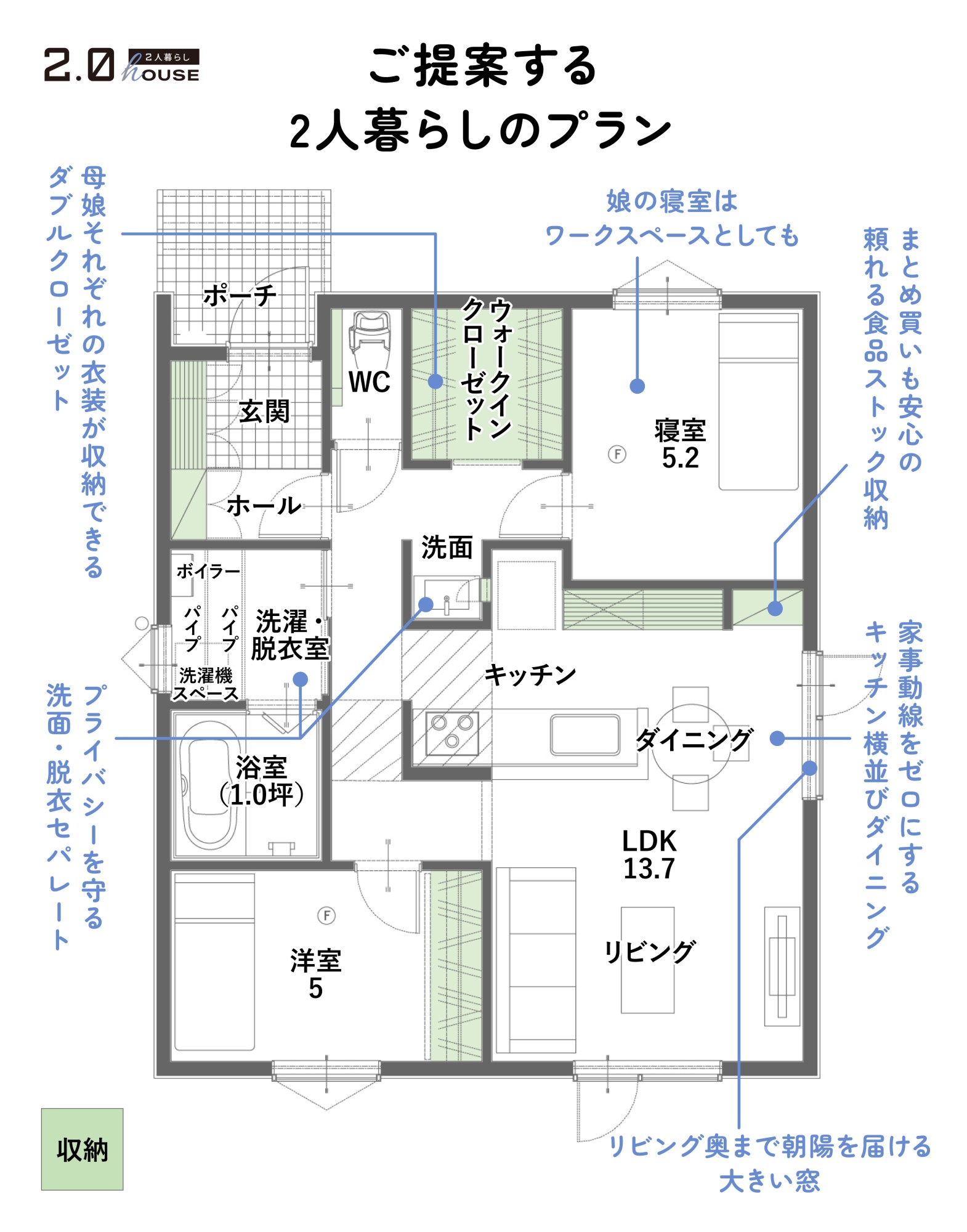 1人暮らし 2人暮らし 3人暮らし 4人暮らし 5人暮らし以上 商品プラン コンセプト 2人暮らしのライフスタイル 平屋 2.0 HOUSE 〜2人暮らしタイプ 2026. 02. 28. 平屋 2人暮らしCタイプ 18坪本体価格1,892万円(税込) 月々47,394円 2026. 02. 28. 平屋 2人暮らしAタイプ 19.24坪本体価格1,936万円(税込) 月々48,496円 2025. 12. 05. 平屋 2人暮らしDタイプ 19.25坪本体価格1,936万円(税込) 月々48,496円 随時見学予約受付中 【予約受付中】平屋最新モデルハウス【オープン】