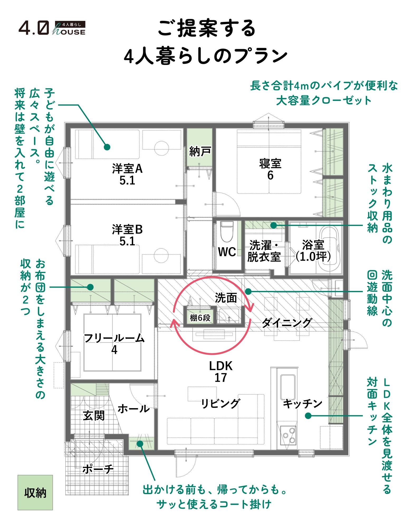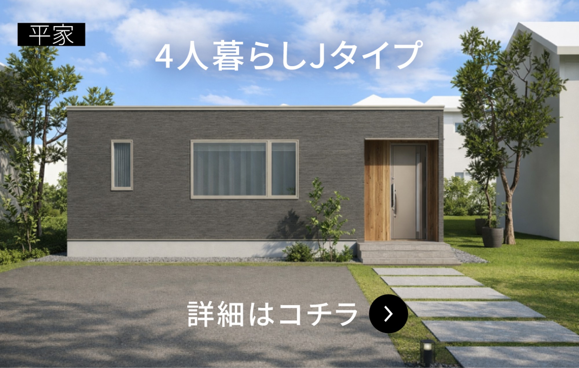 1人暮らし 2人暮らし 3人暮らし 4人暮らし 5人暮らし以上 商品プラン コンセプト 4人暮らしのライフスタイル 平屋/2回建 4.0 HOUSE 〜4人暮らしタイプ 2026. 03. 21. 平屋 4人暮らしEタイプ 26.35坪本体価格2,233万円(税込) 月々55,936円 2026. 03. 21. 2階建て 4人暮らしCタイプ 30.44坪本体価格2,343万円(税込) 月々58,691円 2025. 12. 05. 平屋 4人暮らしJタイプ 26.60坪本体価格2,233万円(税込) 月々55,936円 随時見学予約受付中 【予約受付中】平屋最新モデルハウス【オープン】