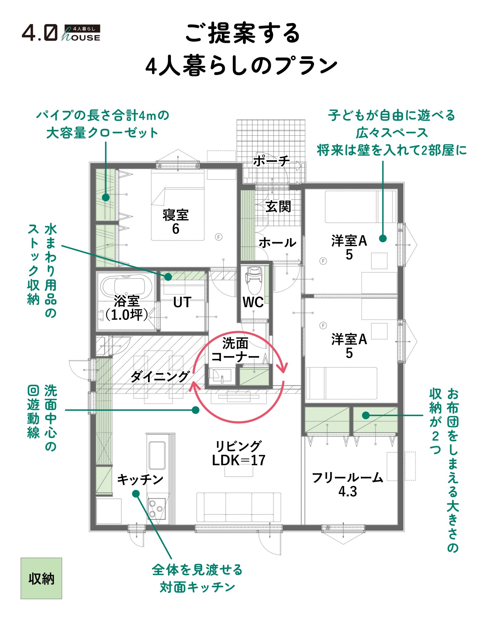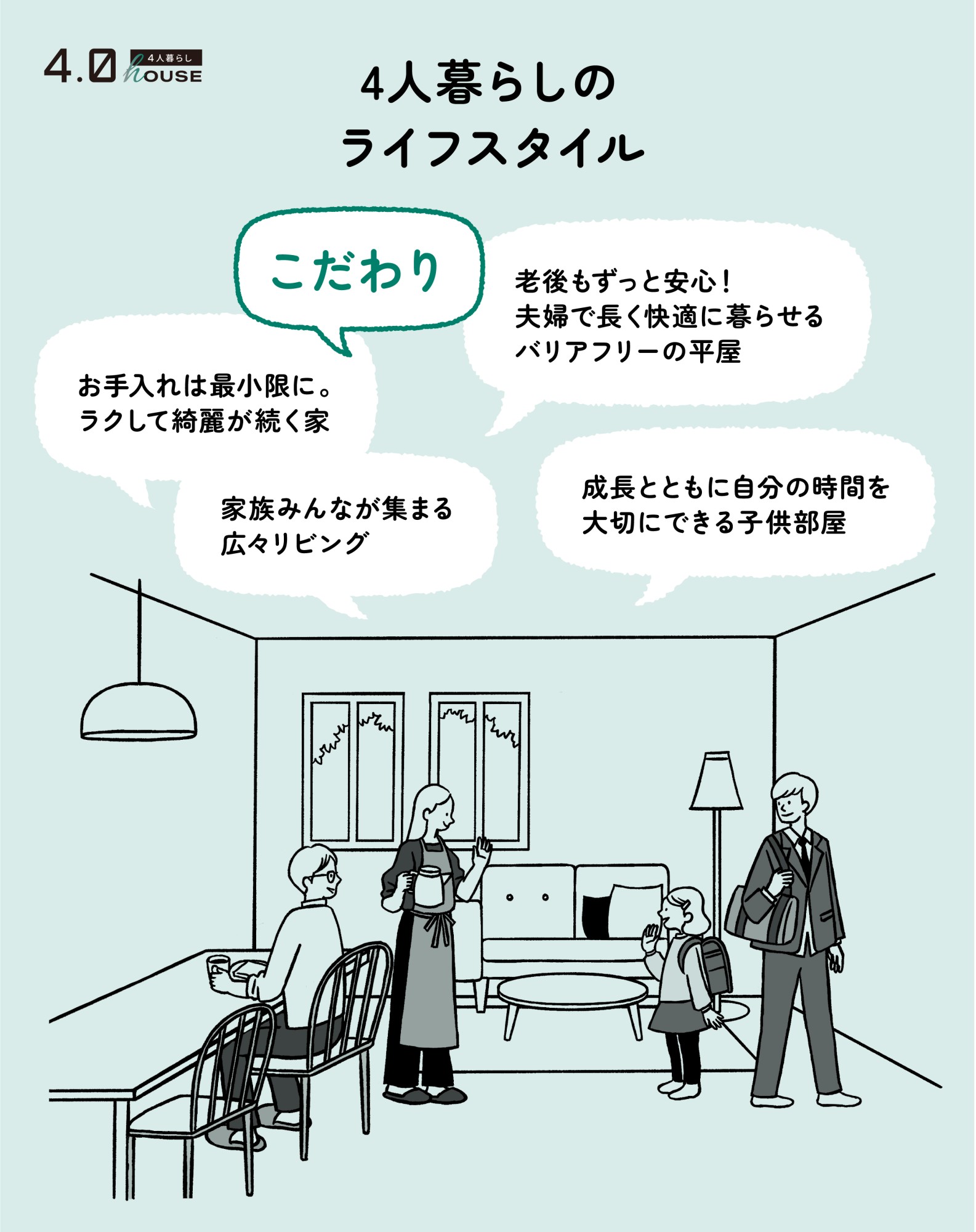 1人暮らし 2人暮らし 3人暮らし 4人暮らし 5人暮らし以上 商品プラン コンセプト 4人暮らしのライフスタイル 平屋/2回建 4.0 HOUSE 〜4人暮らしタイプ 2026. 03. 21. 平屋 4人暮らしEタイプ 26.35坪本体価格2,233万円(税込) 月々55,936円 2026. 03. 21. 2階建て 4人暮らしCタイプ 30.44坪本体価格2,343万円(税込) 月々58,691円 2025. 12. 05. 平屋 4人暮らしJタイプ 26.60坪本体価格2,233万円(税込) 月々55,936円 随時見学予約受付中 【予約受付中】平屋最新モデルハウス【オープン】