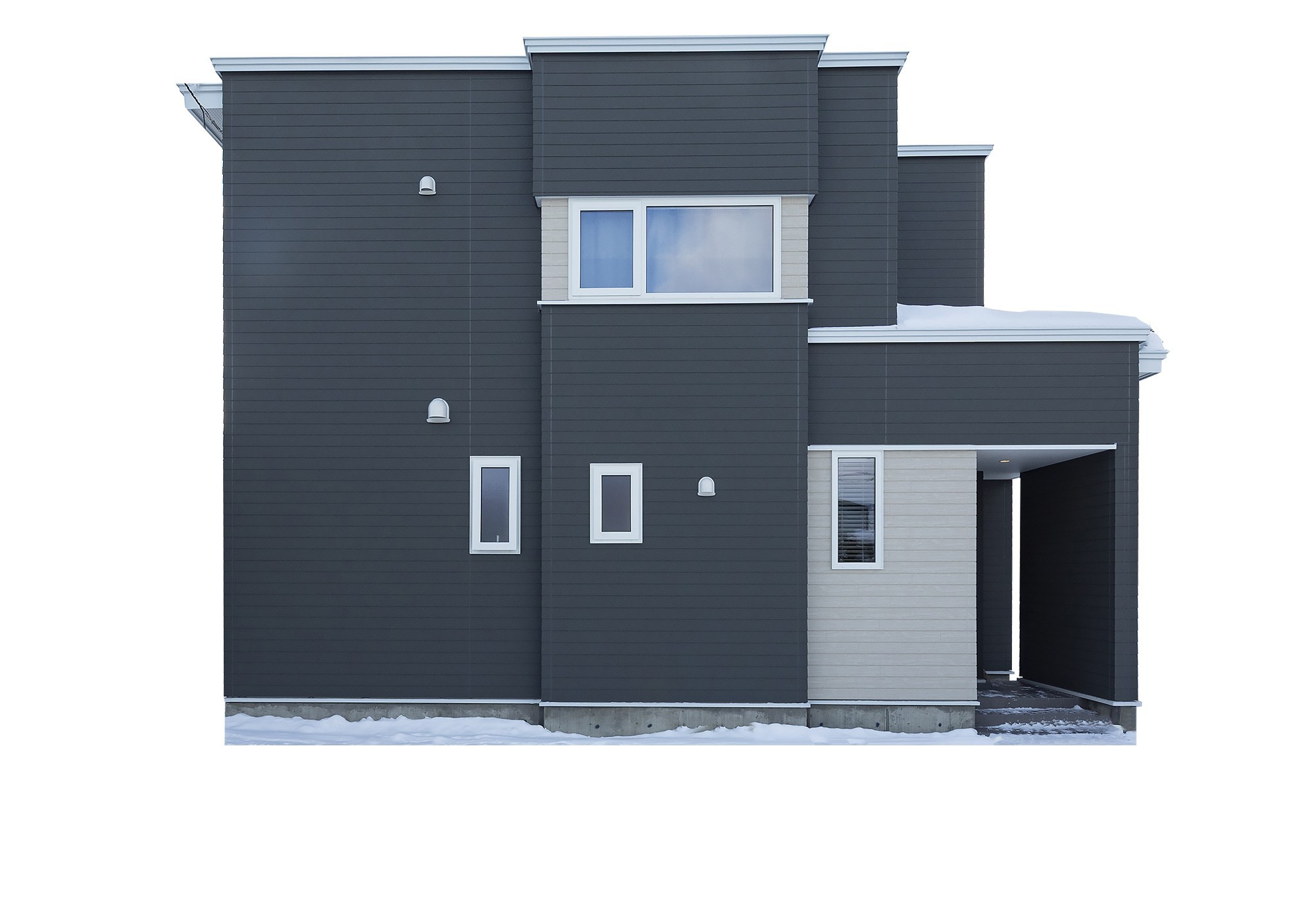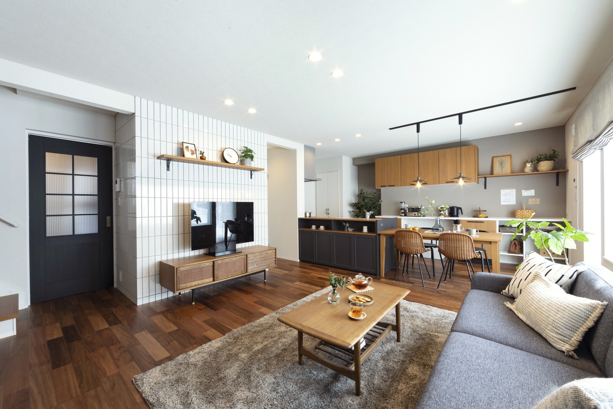 ウッディな空間をきりっと引き締める、ネイビーオークのドアとキッチン。